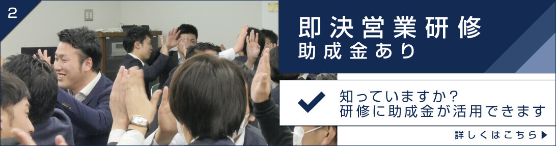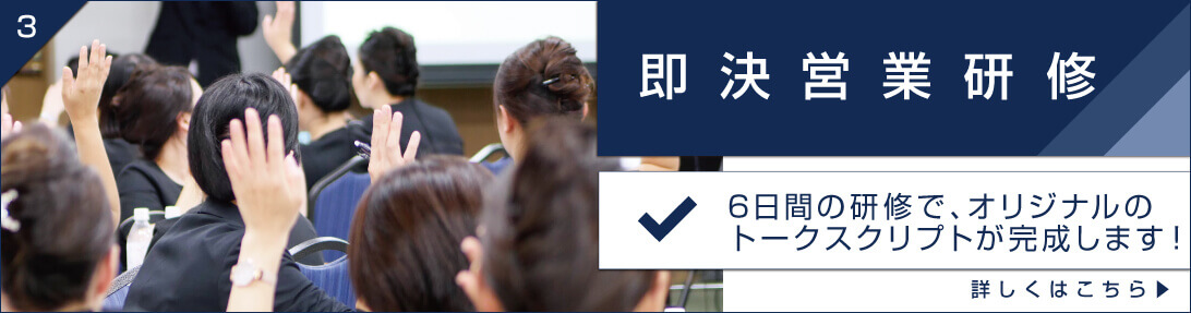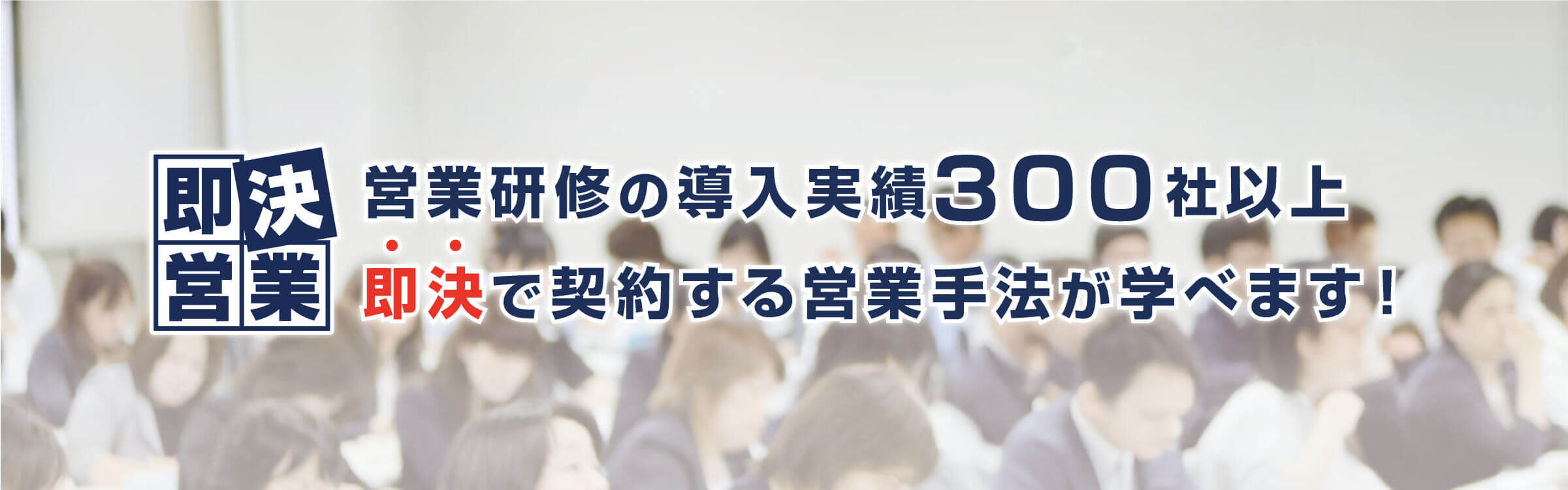 株式会社即決営業は「お客様の『考えます』を攻略する具体的な方法」を、多くの営業パーソンに伝えるために設立されました。お客様の「考えます」を攻略し、その場で契約を成立させるための即決営業メソッドは再現性が高く、今までに200社以上の法人様や、3万人以上のセールスパーソンの方々に弊社の即決営業研修をご受講頂いております。